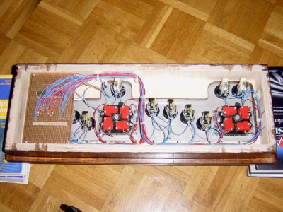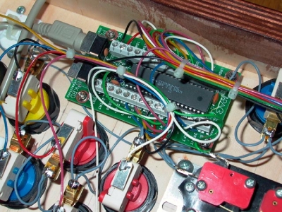 The problem with keyboard controllers is that they can only read a limited number of simultaneous keypresses; especially when playing 2-player games, this sometimes results in strange gameplay. So in in the second revision, I installed an I-pac, a controller chip that was exclusively designed to be used in such machines. The I-pac is also used in controller #2.