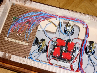 In the first revision of controller #1, the joysticks and buttons (taken from a real arcade machine) were connected to a „hacked“ keyboard controller (see picture 1 and 2); this meant I took the controller chip from an unused keyboard and connected the sticks and buttons to the corresponding keys. I had to decode the keyboard matrix to find the right connections, a quite tricky task.