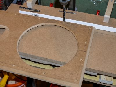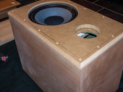 Nach einigen Planungen habe ich das Gehäuse wie folgt konstruiert: Abmessungen ca. 30x48x40cm (BxHxT), resultierendes Nettovolumen ca. 32 Liter, Wandstärke 25mm (MDF), Front- und Rückwand aufgesetzt und mehrfach verschraubt, Wände innen durch Streben versteift und mit Weichfaserplatten beschichtet. Die Gehäuse wurden relativ dicht mit Dämmmaterial gefüllt, die Bassreflexabstimmung erfolgte zuerst näherungsweise rechnerisch und dann abschliessend per Hörtest.