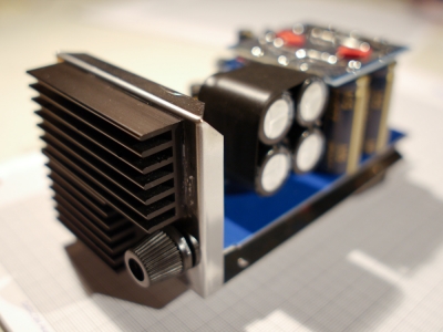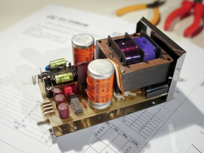 Die erste Siebstufe habe ich durch eine CLC-Brummsiebung frei nach Unisieb ergänzt. Den Kühlkörper für die Montage der Längstransistoren (Brummunterdrückung) bzw. Spannungsregler habe ich auf die Rückseite des Netzteilgehäuses ausgelagert, denn im Gehäuse wird a) die Wärme nicht effektiv abgeführt und b) wäre es schlicht zu eng geworden; das neue Netzteil hat einfach wesentlich mehr Bauteile (u.a. einige größere Kapazitäten), und der DIY-Aufbau braucht einfach etwas mehr Platz als eine industriell gefertigte Platine. Der alte Trafo wurde ausgemustert und durch einen Ringkerntrafo mit sehr großzügig dimensionierten 50VA ersetzt. Dieser wurde in ein externes Gehäuse gepackt, dort findet auch die Gleichrichtung sowie die erste Siebung statt.