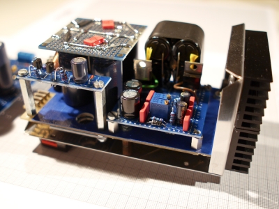 Das originale Netzteil des MBL 4010 ist als symmetrischer Längsregler um einen Regel-IC vom Typ 723 aufgebaut. Dabei wird an den Leistungstransistoren in jedem Spannungszweig eine Eingangsspannung von ca. 34V auf ca. 20V heruntergeregelt, bei einem Strom von jeweils ca. 300-400mA. Das bedeutet, dass hier jede Menge Leistung in Wärme umgewandelt wird. Der dafür vorgesehene Kühlkörper ist sehr klein ausgefallen, aus meiner Sicht völlig unterdimensioniert. Die gesamte Wärme wird in das kompakte Netzteilmodul abgeführt, in dem sich auch der Trafo befindet. Das wird nach geraumer Zeit richtiggehend heiß. Die Ausgangspannung war zudem nicht völlig symmetrisch (ca. 1V Differenz, nicht einstellbar) und im Testbetrieb ohne Gehäuse machte der Versärker einen z.T. instabilen Eindruck mit einigen Störgeräuschen. Zeiweise zog auch das Relais für die Freischaltung der Ausgänge nicht zuverlässig an. Im Gesamtbild fällt das Design des Netzteils gegenüber der übrigen schaltungstechnischen und mechanischen Konzeption des Geräts aus meiner Sicht deutlich ab.