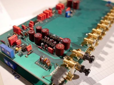 Letzte Maßnahme für die Eingangsmodule: Der MBL 4010 ist komplett DC-gekoppelt; zum Anschluss von Endstufen stehen zwei Ausgänge bereit, einmal konsequenterweise auch direkt/DC-gekoppelt, und einmal über einen Kondensator DC-befreit, falls durch eine komplett bis zu den Endverstärkern DC-gekoppelte Kette Probleme/Schäden bei den Lautsprechern zu befürchten wären. Die kapazitive Kopplung erfolgt im Originalzustand durch zwei in Reihe geschaltete Tantalkondensatoren (je 10µF). Diese habe ich aufgrund des Alters und aus klanglichen Aspekten gegen einen Folienkondensator getauscht. Dabei hatte ich etwas Glück – der neue Kondensator passte von der Höhe her millimetergenau (noch so eben) auf die Platine. Folie hat richtig Volumen…