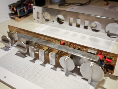 Aller guten Dinge sind drei: Nach Netzteil und Eingangsmodulen war jetzt das Modul mit der Steuerung, den Ausgangsstufen und den Kopfhörerverstärkern an der Reihe. Auf der Platine wurden die ICs gesockelt (das ging hier viel einfacher, weil nicht durchgelötet), die OPVs der Ausgangstufe gegen OPA604 getauscht, das Muting-Relais spannungsmäßig durch 720R in Reihe etwas entlastet (hat sich vorher stark erwärmt), es wurden Elkos zur Pufferung der Betriebsspannung ergänzt (gibt es auf den Eingangsmodulen schließlich auch), und das Poti für die Lauststärkeregelung wurde getauscht. Ein mechanisch passendes Austauschteil habe ich bei Conrad gefunden. Dieses Poti hat zwar keine Rasterung wie das Original, ich war aber froh, überhaupt ein kompatibles Teil zu finden, denn das Poti ist mechanisch schon sehr eng verbaut/umbaut, da war die Auswahl nicht wirklich groß. Kleiner Dämpfer am Rande: Auch dieses Poti hat an einer Position einen massiven Gleichlauffehler, der allerdings so weit im unteren Bereich liegt, dass dies kaum stört, zumal man den Regelbereich des Laustärkereglers durch die -20dB-Taste gut umschalten kann.